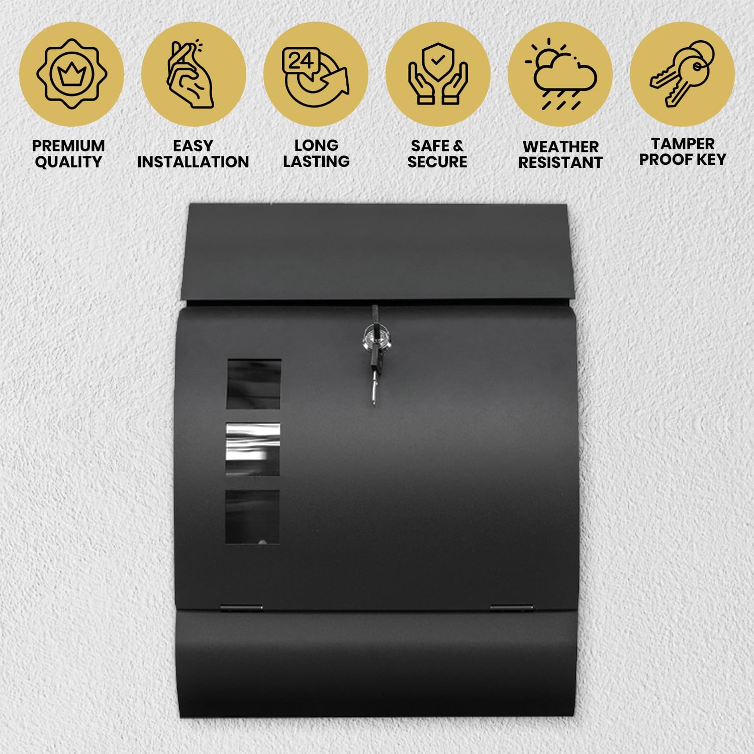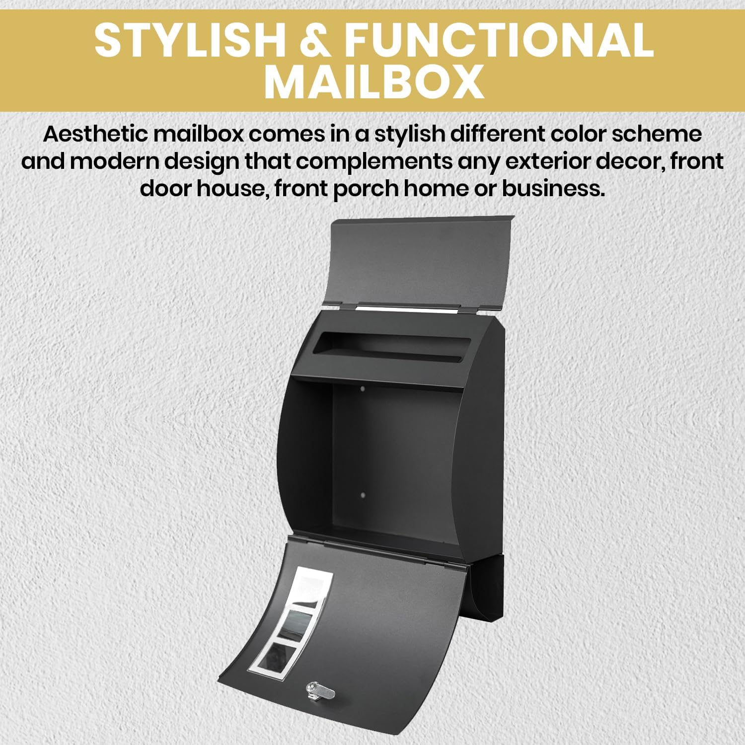 - Modern Design: Featuring a sleek black color and modern design, this aesthetic mailbox adds a touch of elegance to any exterior decor, whether it's your front door, porch, or business entrance.