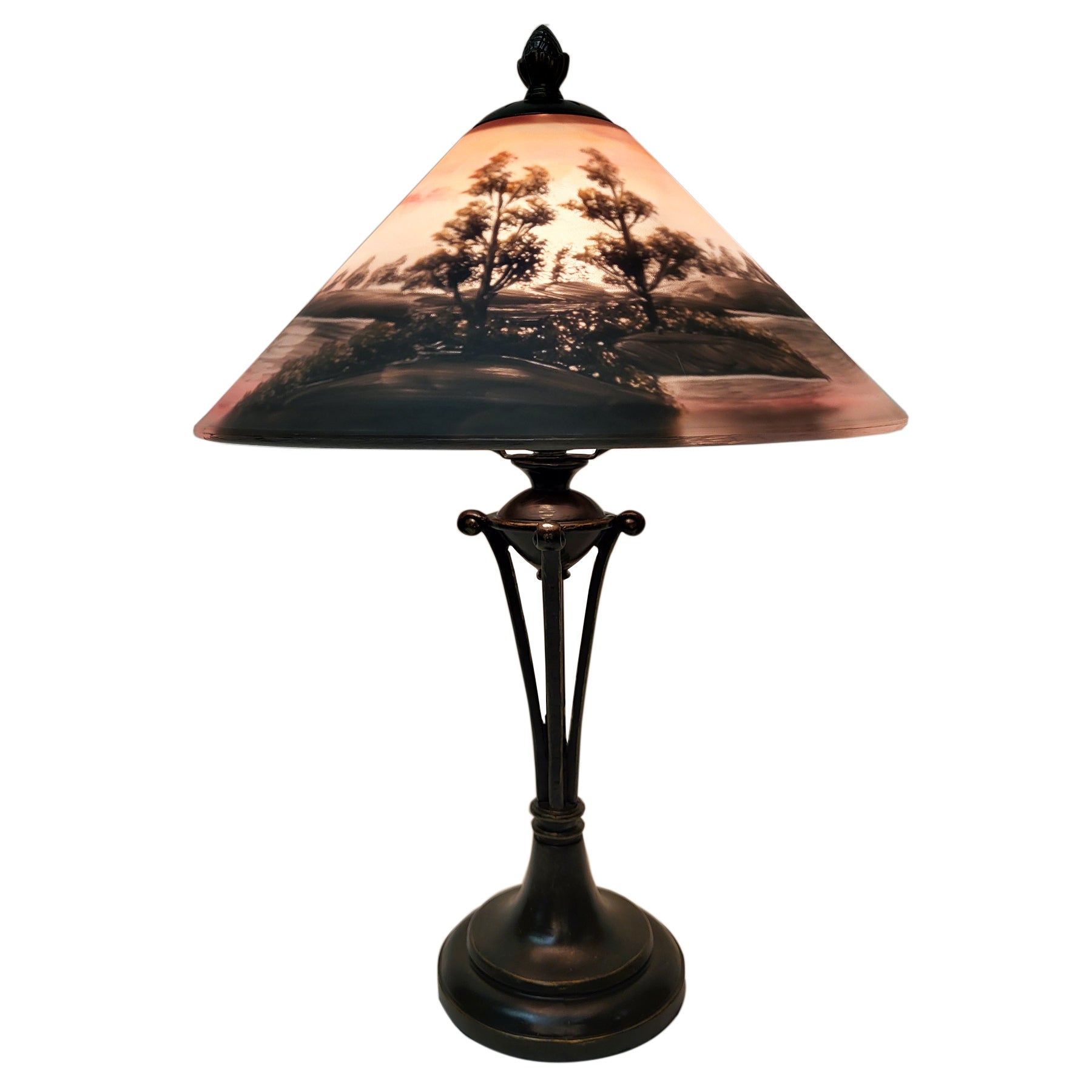 Illuminate your space with timeless elegance using our Fine Art Lighting Hand-Painted Handel Style Glass Table Lamp. Skillfully hand-painted from the inside, the lamp shade features a scenic landscape design in rich hues of red, yellow, and orange. Measuring 12"D x 17.25"H, this Handel-style lamp creates a beautiful perspective with contrasting colors when lit. Perfect for the bedroom, living room, or office, it adds vintage-inspired elegance to any decor. Handel lamps are high-quality lamps produced in the late 19th and early 20th centuries. They're known for their reverse hand-painted, and crafted with intricate designs. The lamps come in various styles, including Art Nouveau and Art Deco, and are prized by collectors for their craftsmanship and beauty.