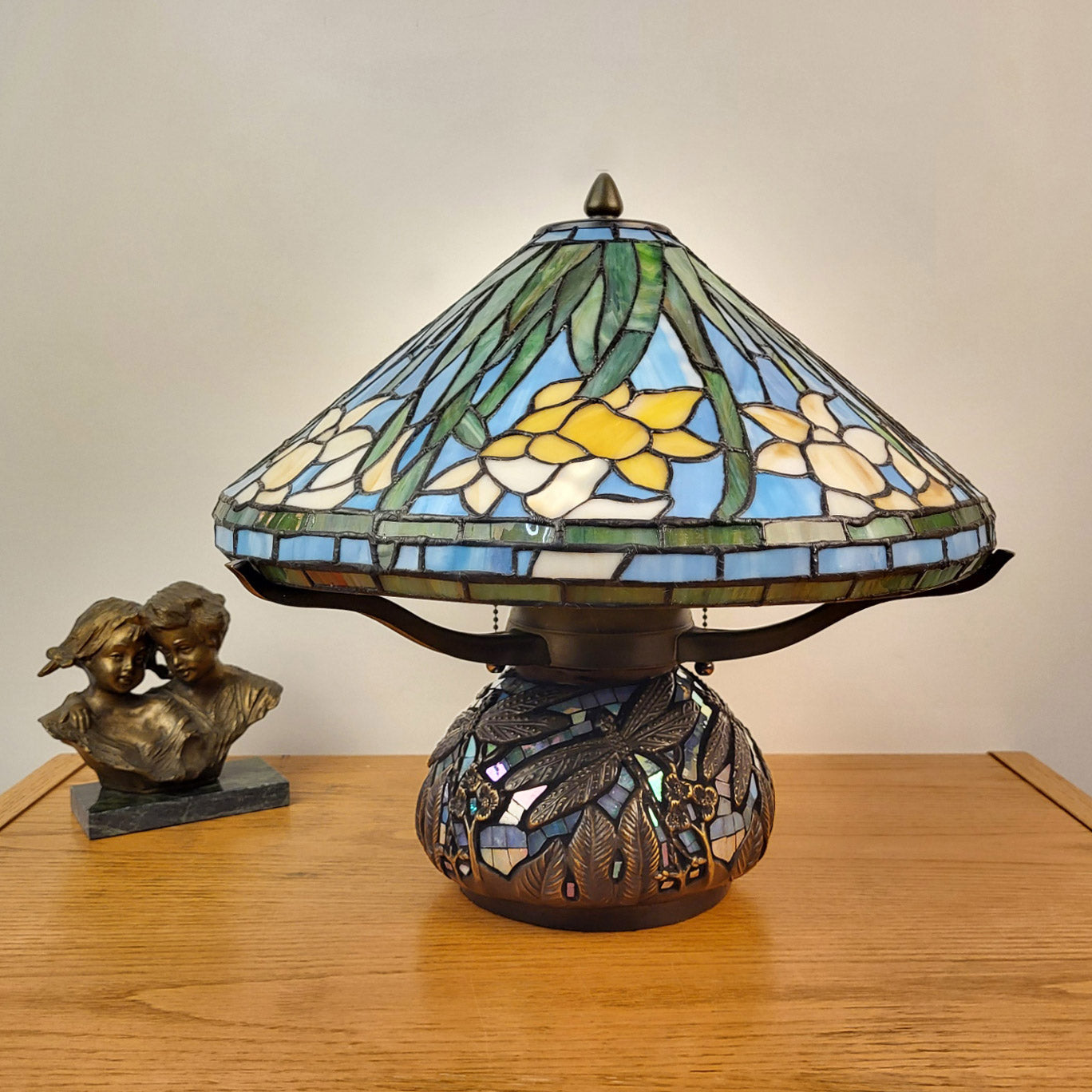 - BEAUTIFUL DESIGN: Inspired by Louis Tiffany’s original creation, this exquisite lamp showcases a delicate daffodil motif. When illuminated, the vibrant stained glass radiates warmth, creating a stunning focal point in any room.